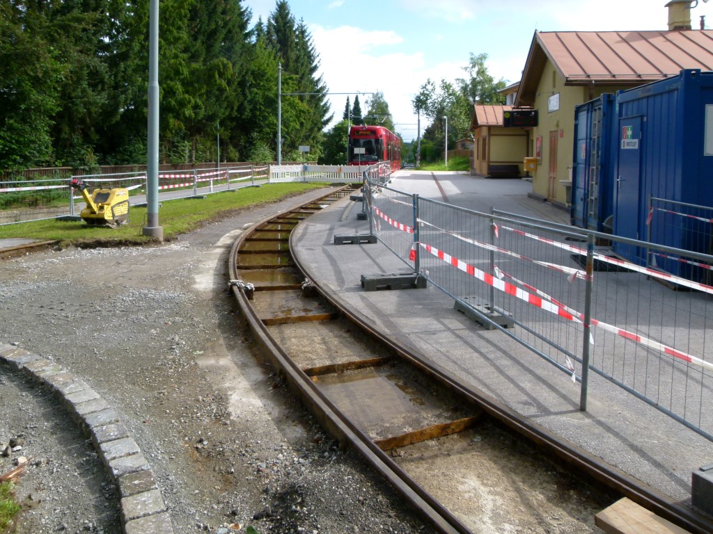 Am Gelände des Bahnhofs Igls ist derzeit ein Teil des Asphaltbelages und auch des Rasengleises abgetragen.